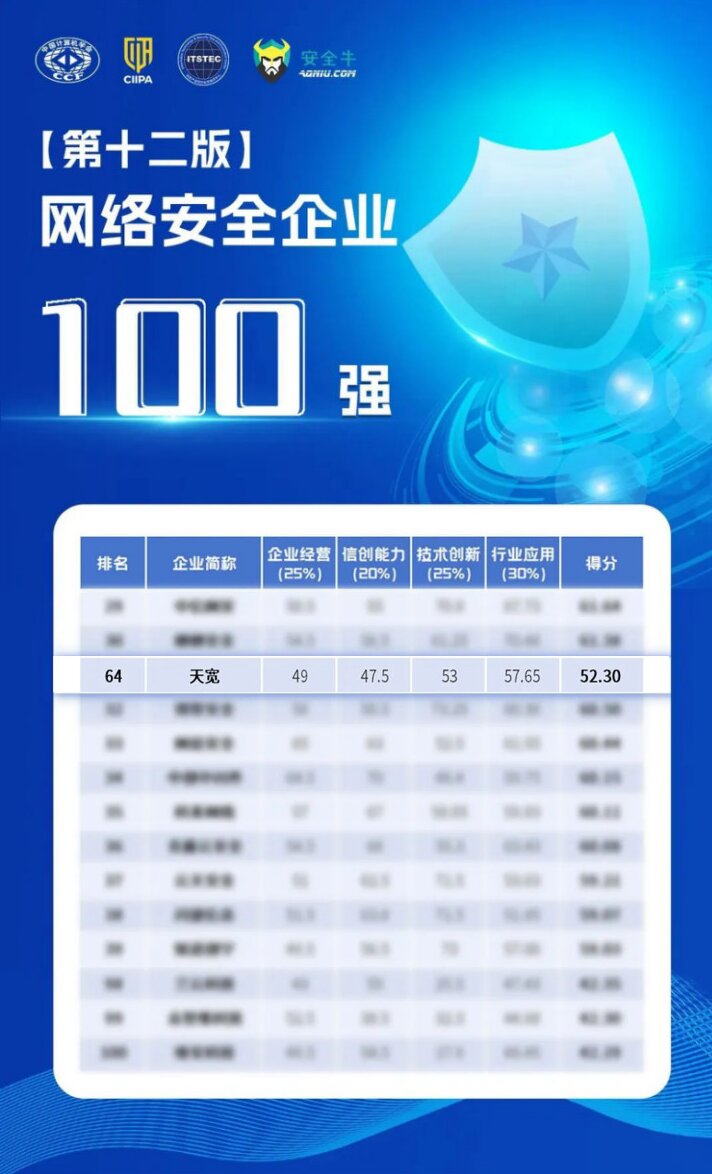 近日,由中国计算机学会(CCF)抗恶劣环境计算机专委会、中关村华安关键信息基础设施安全保护联盟、信息产业信息安全测评中心、安全牛联合发起的第十二版《网络安全企业100强》正式发布。天宽凭借在技术创新、行业应用等方面的突出实力,连续五年蝉联百强榜单。