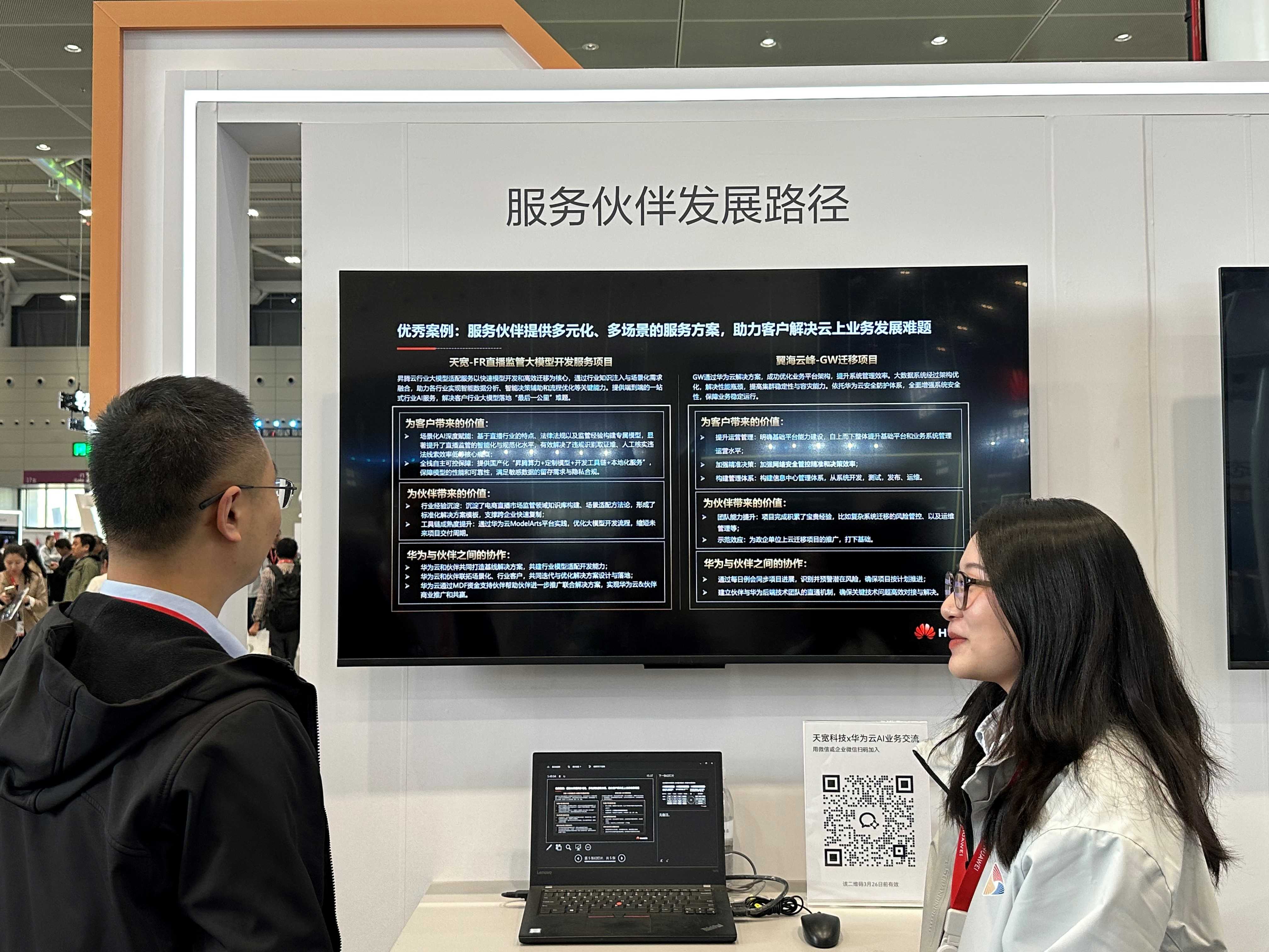大会期间,天宽在华为云盘古大模型展区和华为云服务展台全面展示了基于昇腾的行业大模型及创新解决方案,受到观展嘉宾的热烈关注,并与参会嘉宾就算力建设、模型迁移、AI行业模型落地等行业前沿话题进行深入的交流与探讨。